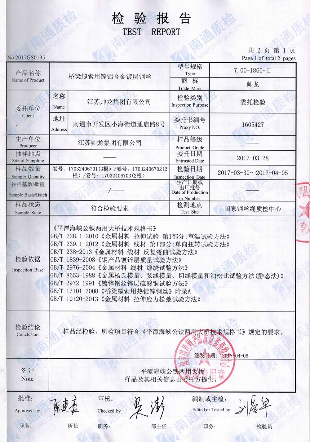 镀锌钢丝检测报告(平潭海峡公铁大桥)