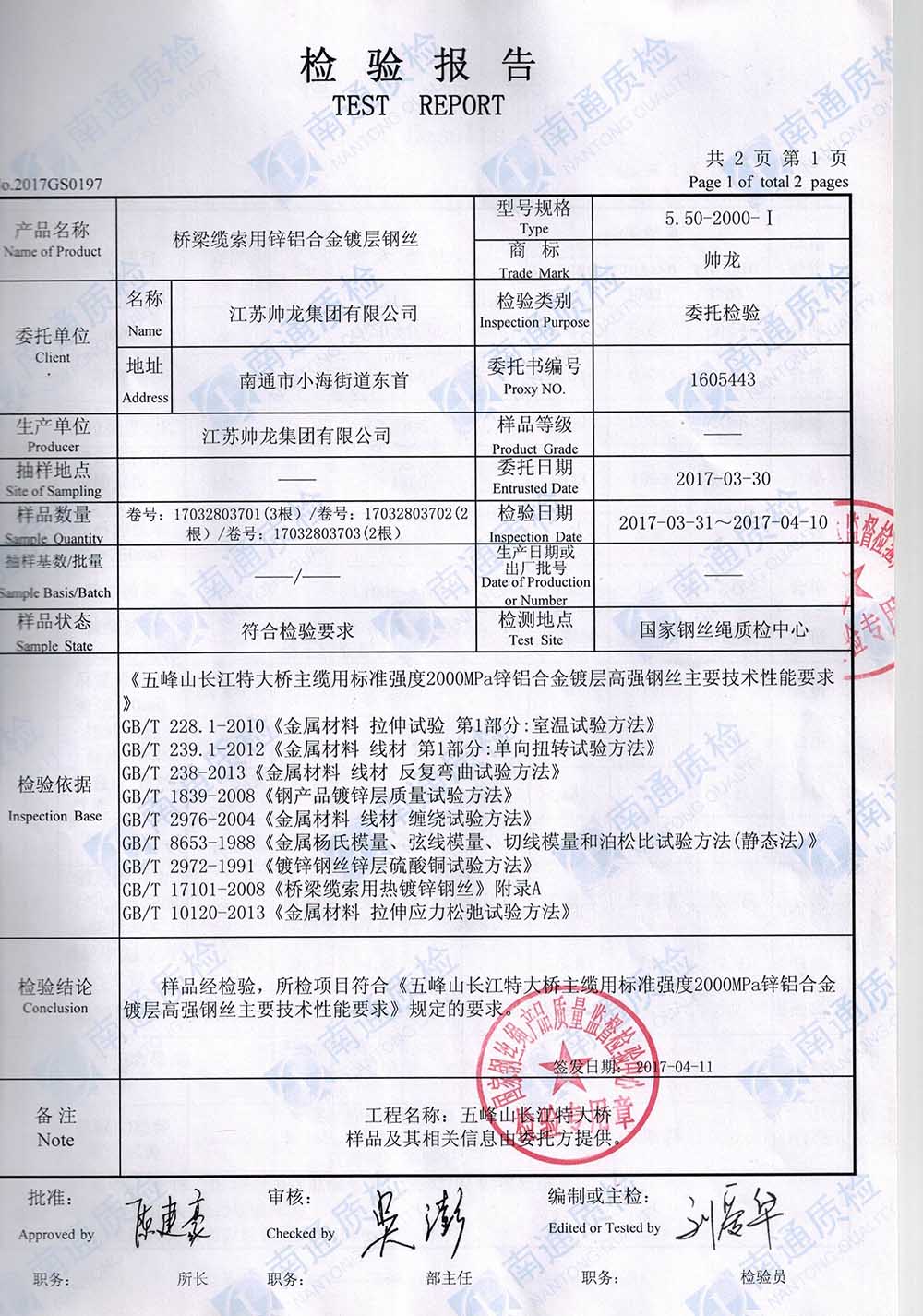 镀锌钢丝检测报告(五峰山特大桥)